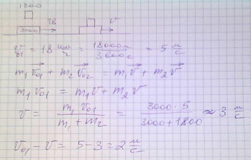 На вагонетку массой 3 т катящуюся по горизонтальному пути со скоростью 18 км/ч насыпали сверху 1200 кг щебня. На сколько при этом уменьшилась скорость вагонетки?