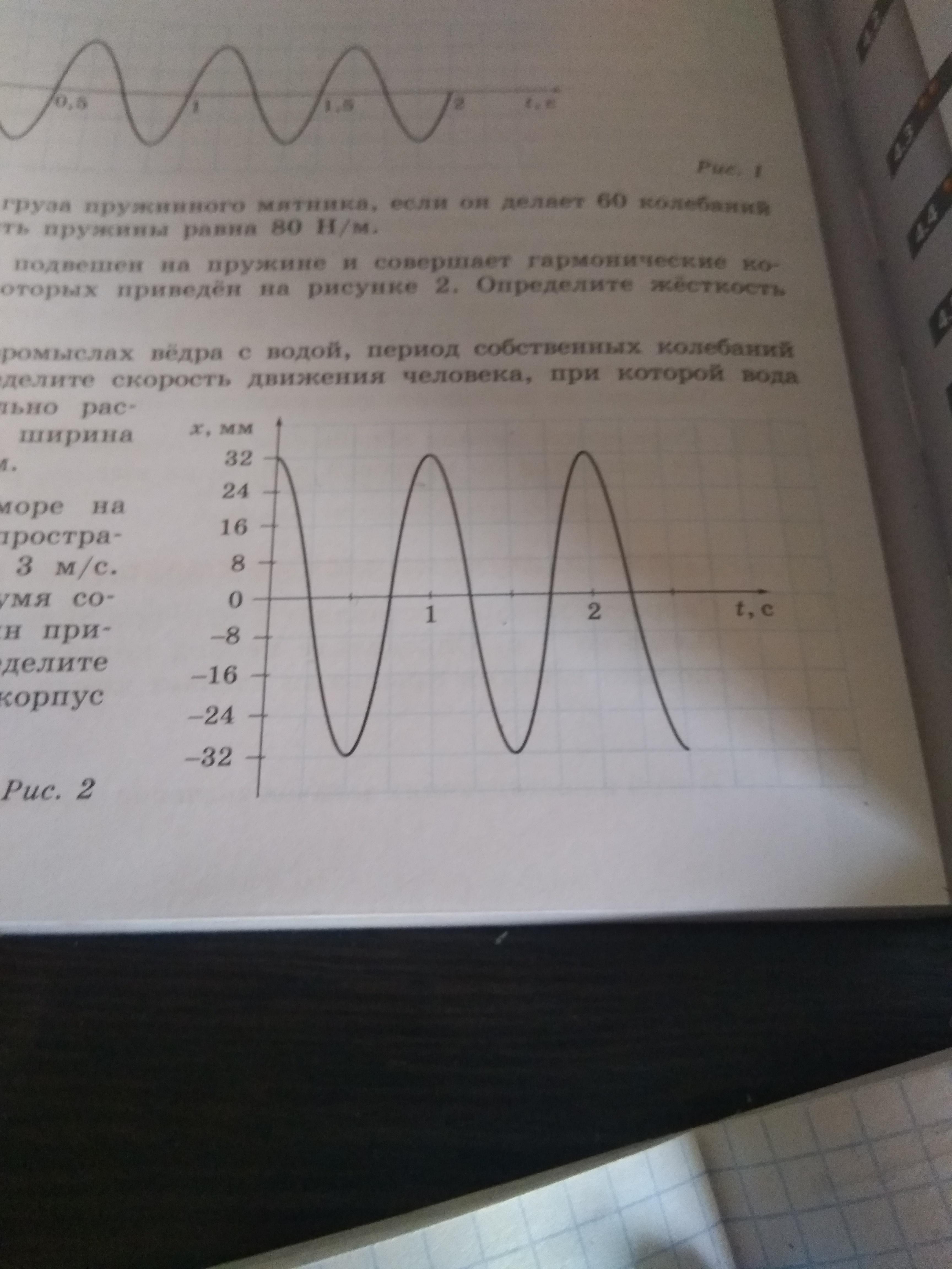 Чтобы определить период по графику, надо найти кусок графика, который повторяется. Здесь я беру кусок волны. Он начинается при t=0.25 с (одна клетка) и через 4 клетки (при t=1.25 с) заканчивается. Дальше этот кусочек волны опять повторяется снова. Значит период равен: 1.25-0.25=1 с (4 клетки)
