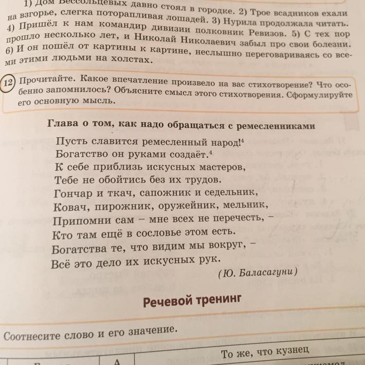 1)Мне очень понравилось стихотворение. 2) мне запомнилось первая строчка стихотворения. Основная мысль -это ремесленный народ