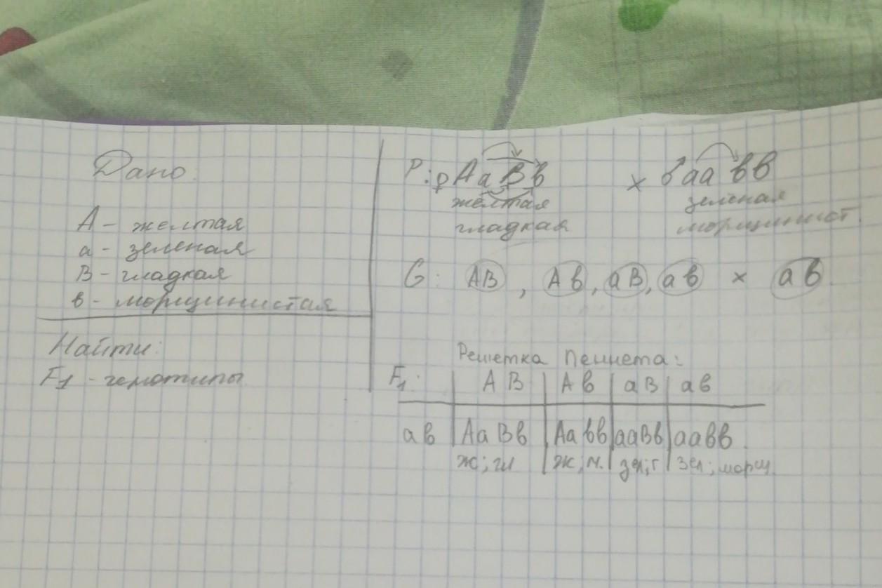 1.Каковые генотипы родителей и гибридов F1, если желтая окраска семян у гороха доминирует над зеленой, а гладкая над морщинистой?
