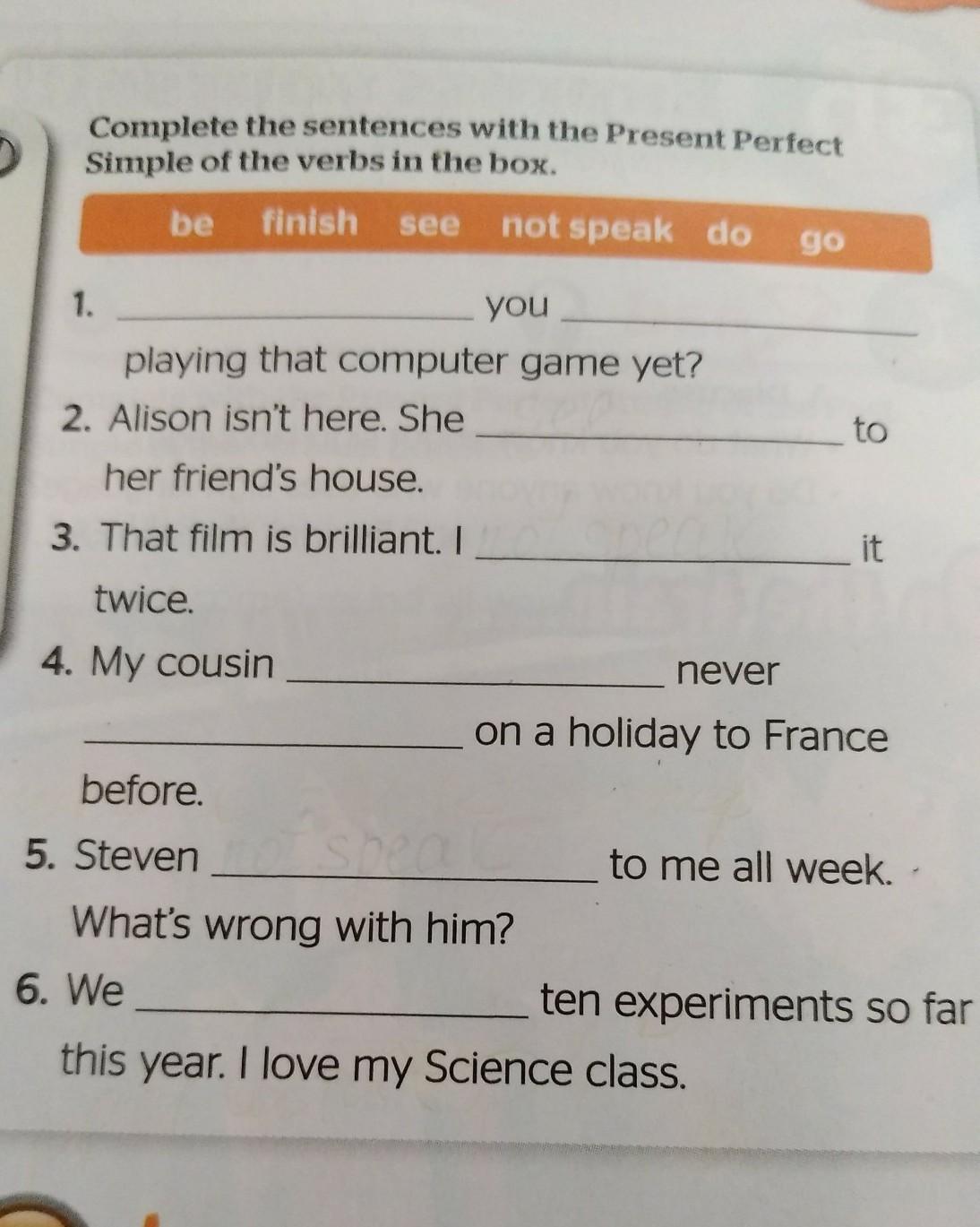 1 have, finished.2 has gone.3 have seen.4 has never been.5 hasn't spoken.6 have done.