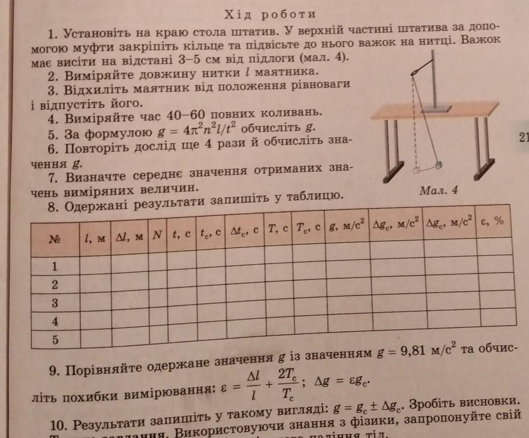 Работа выполняется парой. Один тянет грузик на себя, расстояние от точки покоя над полом измеряете линейкой, записываете во 2-ой столбик таблицы. 1 ПОЛНОЕ КОЛЕБАНИЕ - ЭТО ТУДА И ОБРАТНО! То есть к Вам, а после к вашему соседу и, когда грузик вернётся к Вам, это и будет 1 полное колебание. Засекаете время и следите за ним(40 колебаний). Число 40 - третья колонка, время - 4 колонка.