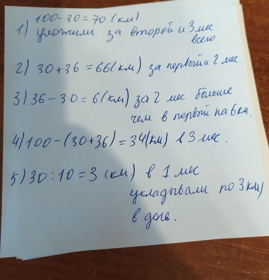 решите задачу: Бригада вкладчиков должна была уложить 100км железной дороги за месяц. За первую декаду(10 дней) - 36 км. Объясни, что обозначает каждое выражение. 100-30, 30+36, 36-30, 100-(30+36), 30:10