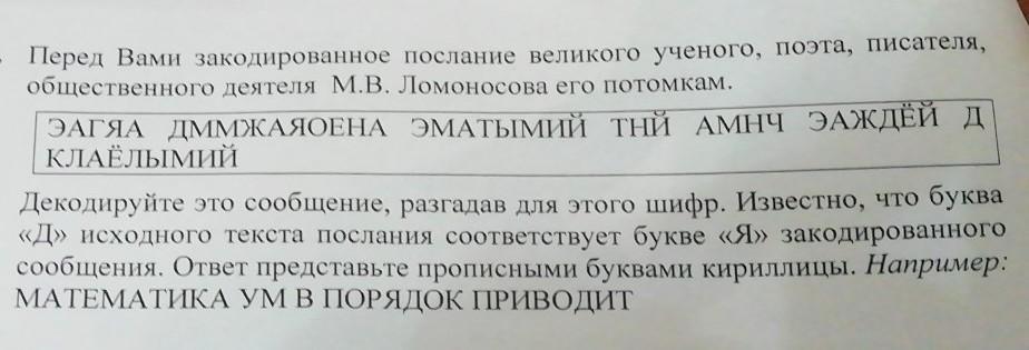 Это решается с помощью шифра Цезаря. В задании обозначено, что буква "Д" соответствует букве "Я" закодированного сообщения.