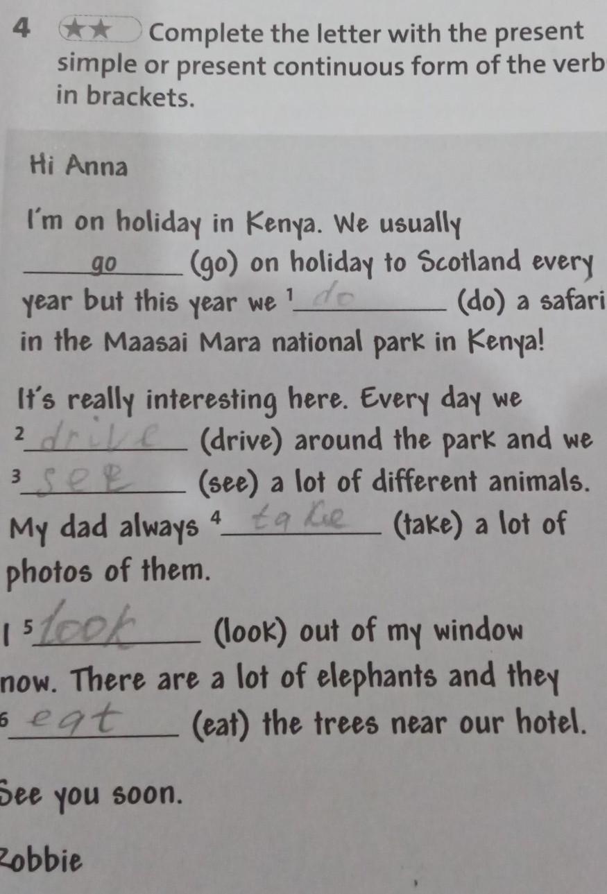 Hi Anna I'm on holiday in kenya, We usually go (go) on holiday to scotland every year but this yera we go(do)to a safari in the Maasai Mara national park in Kenya! It's really interesting here. Every day we're driving(drive) around the park and we see (see) a lot of different animals. My dad always takes (take) a lot of photos of them. I'm looking(look) out of my window now. There are a lot of elephants and they are eating (eat) the trees near our hotel. See you soon. Robbie.