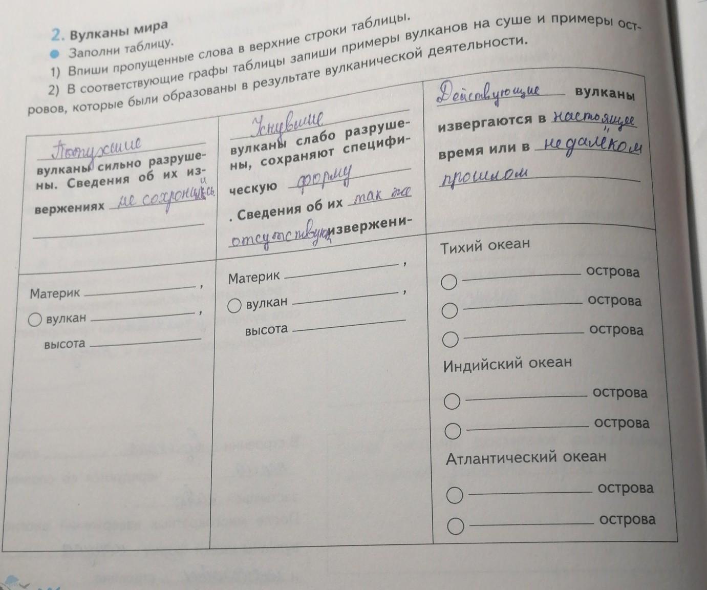 1) Материк Евразия, вулкан Бонгабти, высота 1821м. 2) Материк Южная Америка, вулкан Аконкагуа, высота 6962м. 3) Тихий океан: Филлипинские острова, Соломоновы острова, Японские острова. Индийский океан: Коморские острова, Маврикий острова. Атлантический океан: Сандвичевы острова, Канарские острова