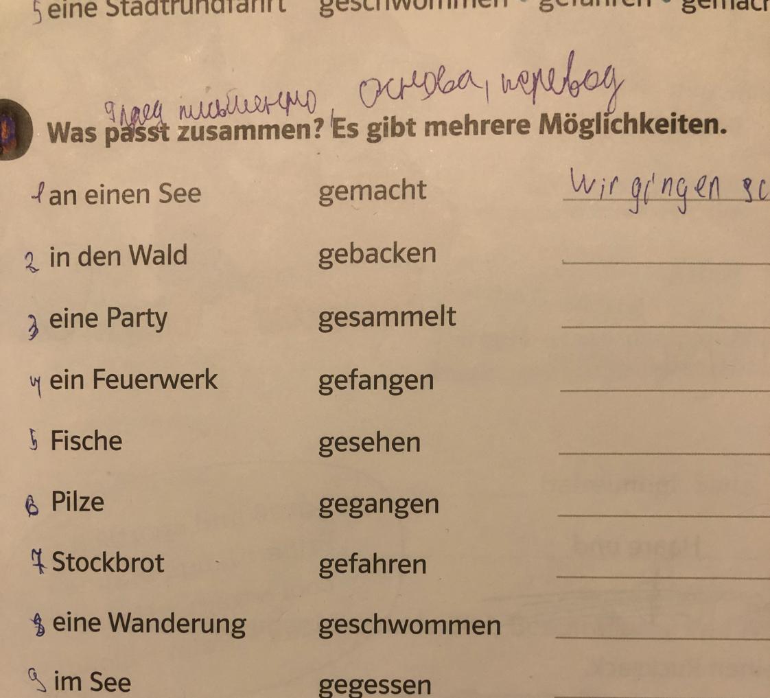 Wir haben Pilze gemacht (готовили)/ gebacken (пекли)/ gesammelt (собирали)/ gesehen (видели).