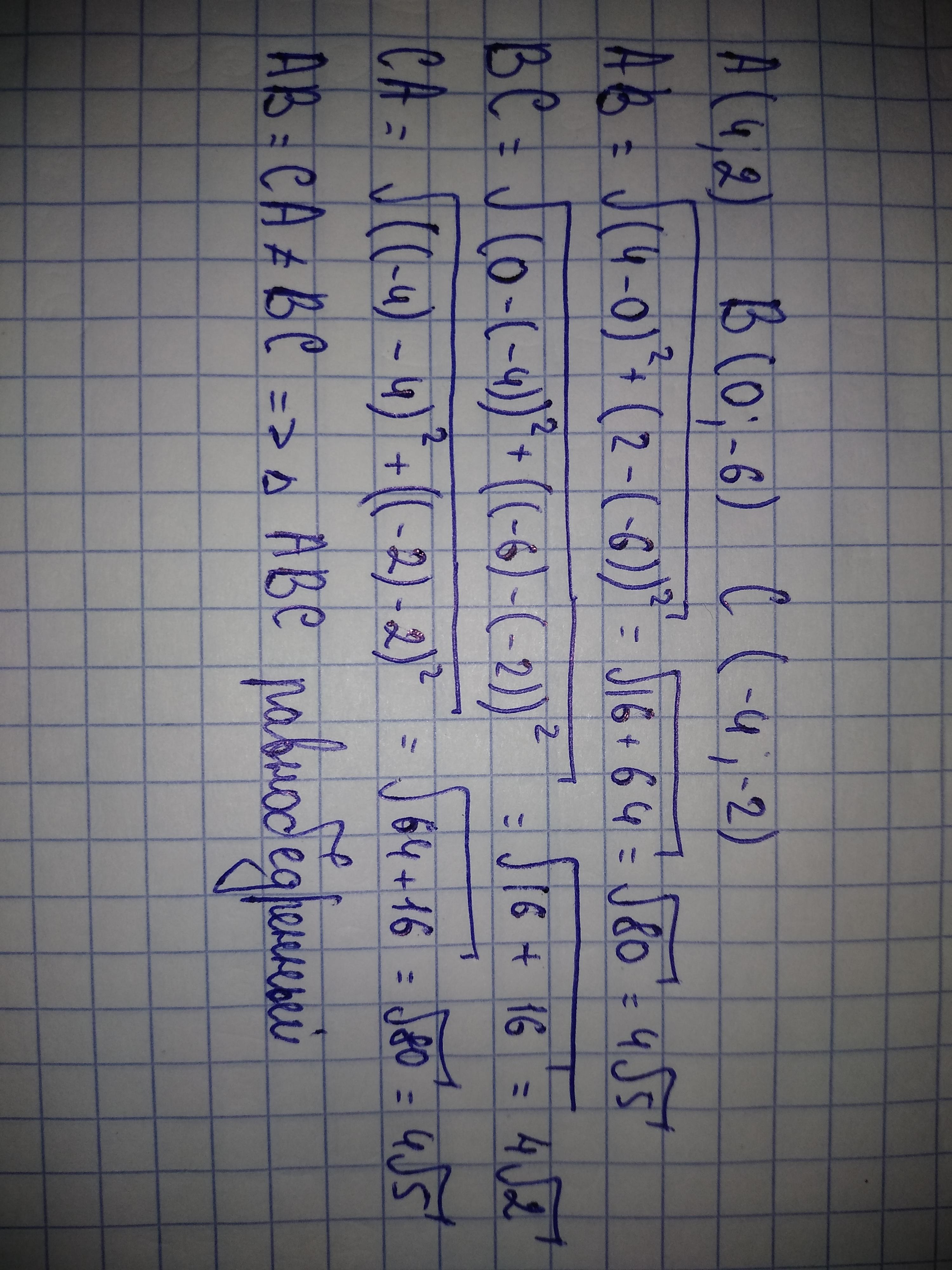 треугольник задан координатами своих вершин A (4;2), B (0; -6), C (-4;-2). докажите, что это треугольник равнобедренный