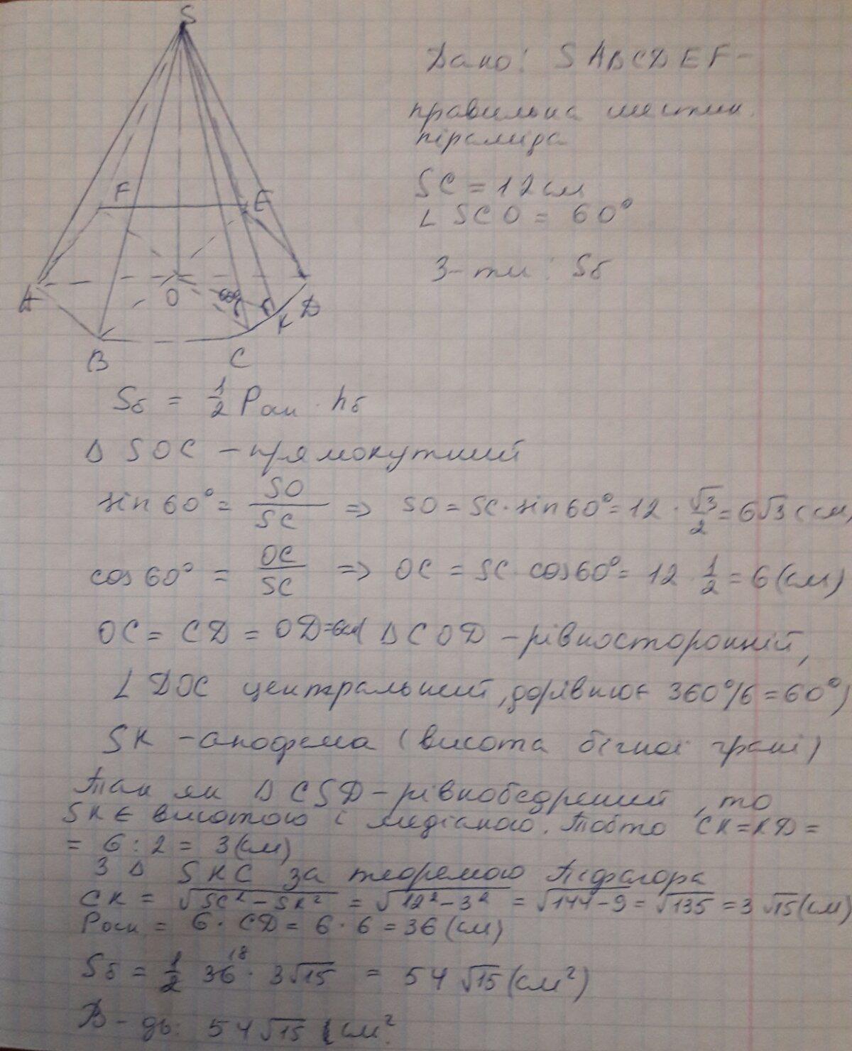бічне ребро правильної шестикутної піраміди дорівнює 12 см і утворює з площиною основи кут 60°. ЗНАЙТИ ПЛОЩУ БІЧНОЇ ПОВЕРХНІ ПІРАМІДИ. ДАЮ 50 БАЛІВ!!!!!