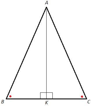 В равных треугольниках против равных сторон лежат равные углы. Треугольники ABK и ACK имеют общую сторону AK, следовательно углы против нее равны. ∠ABK=∠ACK. Треугольник BAC - равнобедренный, BC - основание, AB=AC. Опять таки в равных треугольниках против равных сторон лежат равные углы, ∠AKB=∠AKC. Эти углы являются смежными, их сумма 180. Следовательно ∠AKB=180/2=90.