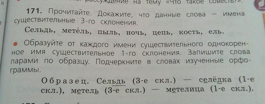 пыль(3-е скл,ж.р.)-пыльца(1-е скл),ночь(3-е скл,ж.р.)-ночевка(1-е скл),цепь(3-е скл,ж.р.)-цепочка(1-е скл),кость (3-е скл, ж.р.)-косточка(1-е скл),ель(3-е скл,ж.р.)-елочка(1-е скл)