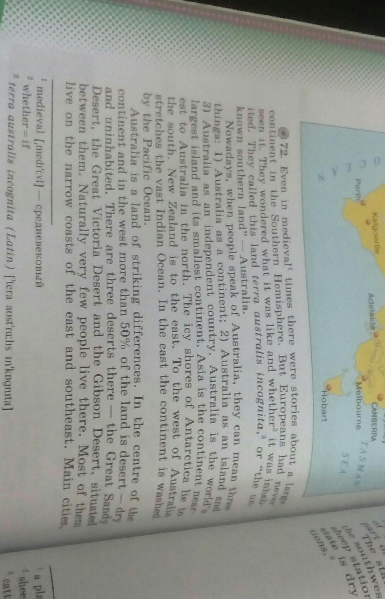 72. Даже в средневековье были истории о большом континенте в Южном полушарии. Но европейцы никогда не видели этого. Они задавались вопросом, на что это было похоже и было ли это сделано. Они называли эту землю terra australis incognita, или «известную южную землю». В наши дни, когда люди говорят об Австралии, они могут иметь в виду три вещи: 1) Австралия как континент; 2) Австралия как остров и 3) Австралия как независимая страна. Австралия - это мир Австралии. самый большой остров и его самый маленький континент. Азия - континент, расположенный ближе всего к Австралии на севере. Ледяные берега Антарктиды лежат на юге. Новая Зеландия на восток. К западу от Австралии простирается обширный Индийский океан. На востоке континент омывается Тихим океаном. Австралия - страна поразительных различий. В центре континента и на западе более 50% суши пустынны и необитаемы. Между ними расположены три пустыни: Большая песчаная пустыня, Большая пустыня Виктория и пустыня Гибсон. Естественно, там мало кто живет. Большинство из них живут на узких берегах востока и юго-востока. Главные города средневековья [medr'ivl]