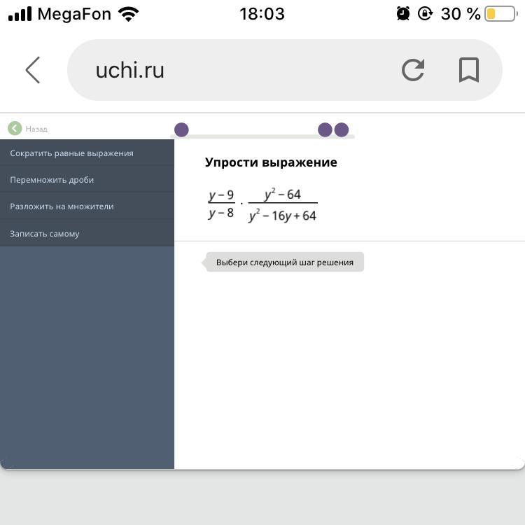 \frac{y - 9}{y - 8}  \times  \frac{ {y}^{2} - 64 }{ {y}^{2}  - 16 y+ 64}  =  \\  \frac{y - 9}{y - 8}  \times  \frac{(y - 8)(y + 8)}{ {(y -8)}^{2} }  =  \\  \frac{(y - 9)(y + 8)}{(y - 8)^{2} }  =  \frac{ {y}^{2}  - y - 72}{ {y}^{2}  - 16y + 64}