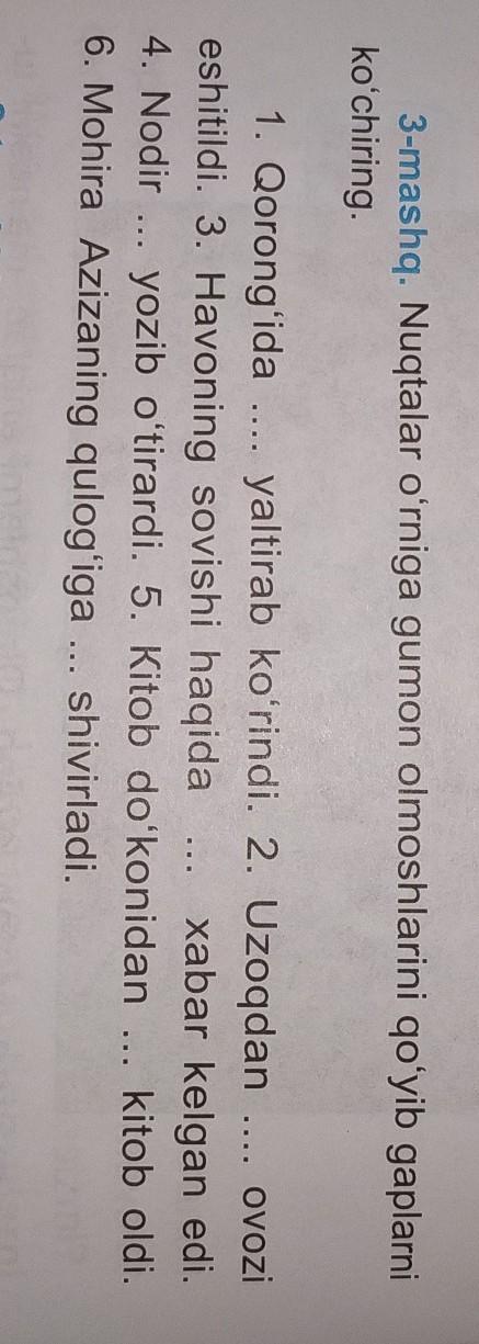 Ответ:1) nmadir 2) kimningdir 3) allakimdan 4)allanimalarni 5) allaqanday 6)birnimalarni