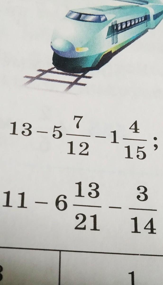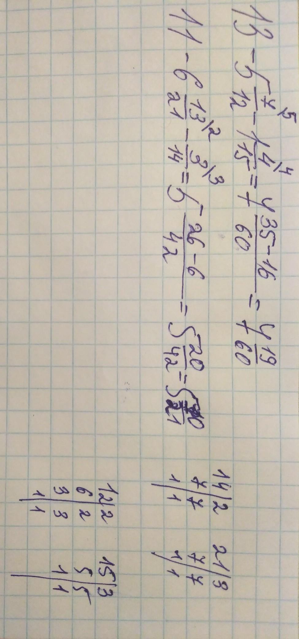 Чтобы решить эти примеры нужно найти общий знаменатель. Чтобы было легче найти общий знаменатель, надо разложить знаменатели на множители. А пока мы будем считать знаменатель, можно сразу найти целое число. Ну тут ничего сложного просто отнимаешь и всё. На прикреплённой фотографии видно, что множители числа 12=2*2*3, а у числа 15=3*5. Так вот, чтобы найти общий знаменатель надо умножить множители 12 на множители 15, которых у 12 нет и наоборот, т. е. 2*2*3*5 или 3*5*2*2. Из этого следует, что общий знаменатель у них 60. Теперь осталось найти числитель. Нужно просто то число, на которое умножил 12, написать над 7, т. е. поставить кармашек (или как его называют) над 7 и написать число, в нашем случае это 5, следует, что 7*5=35. То же самое делаем с 4. Дальше осталось только от 35 отнять 16. Всё. Со вторым примером то же самое.