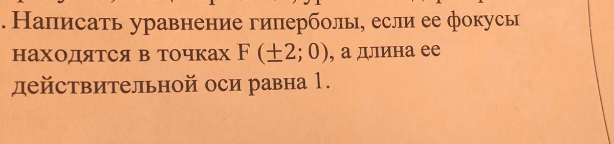 Написать уравнение гиперболы , если ее фокусы находятся в точках F(+-2;0), а длина ее действительной оси равна 1.