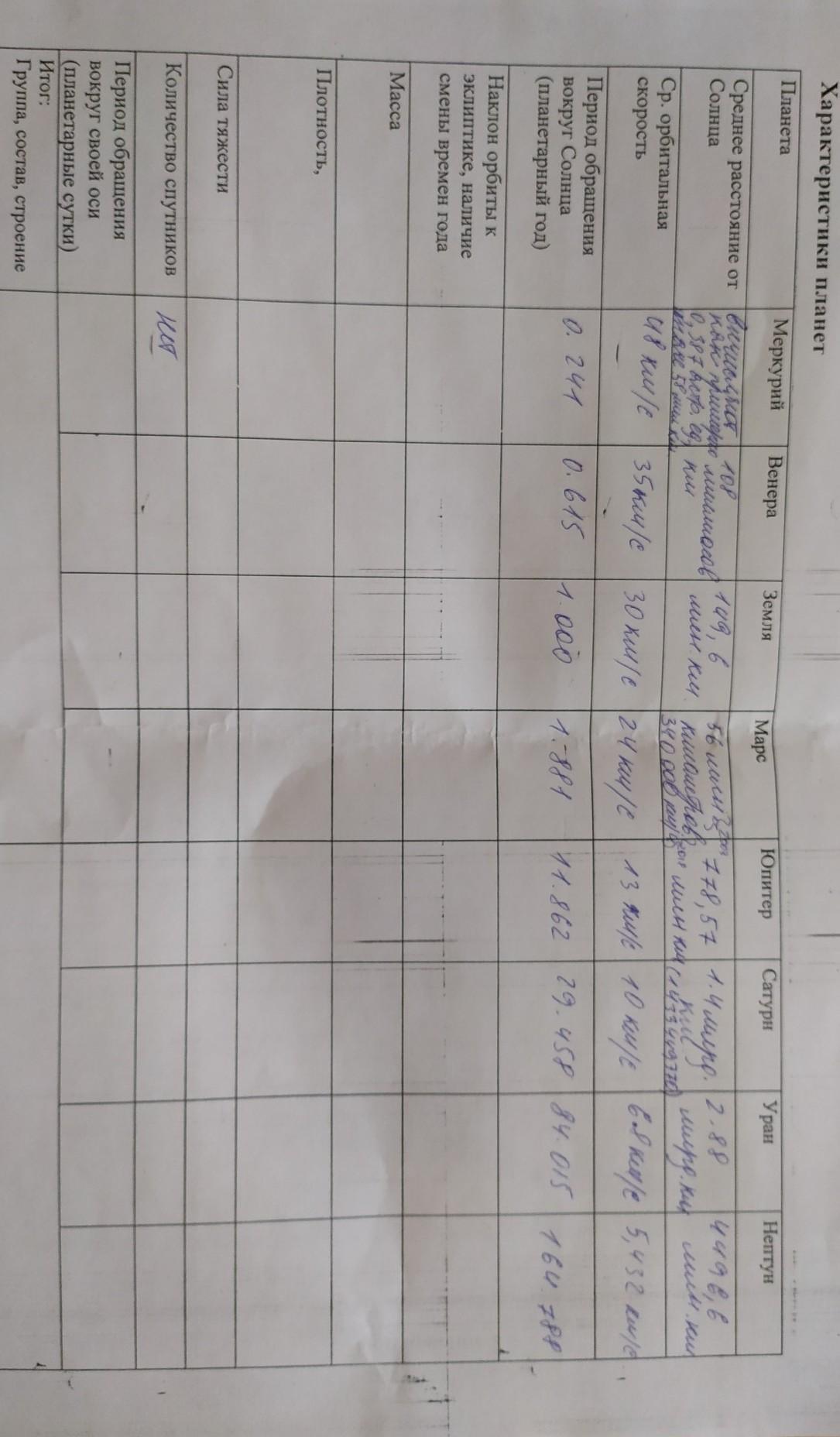 Земля: Наклон орбиты к эклиптике 0.0, смена времен года есть, масса 5.97×10²⁴ кг, плотность Земли 5.52 г/см³, 1 спутник, планетарные сутки 1 земные сутки