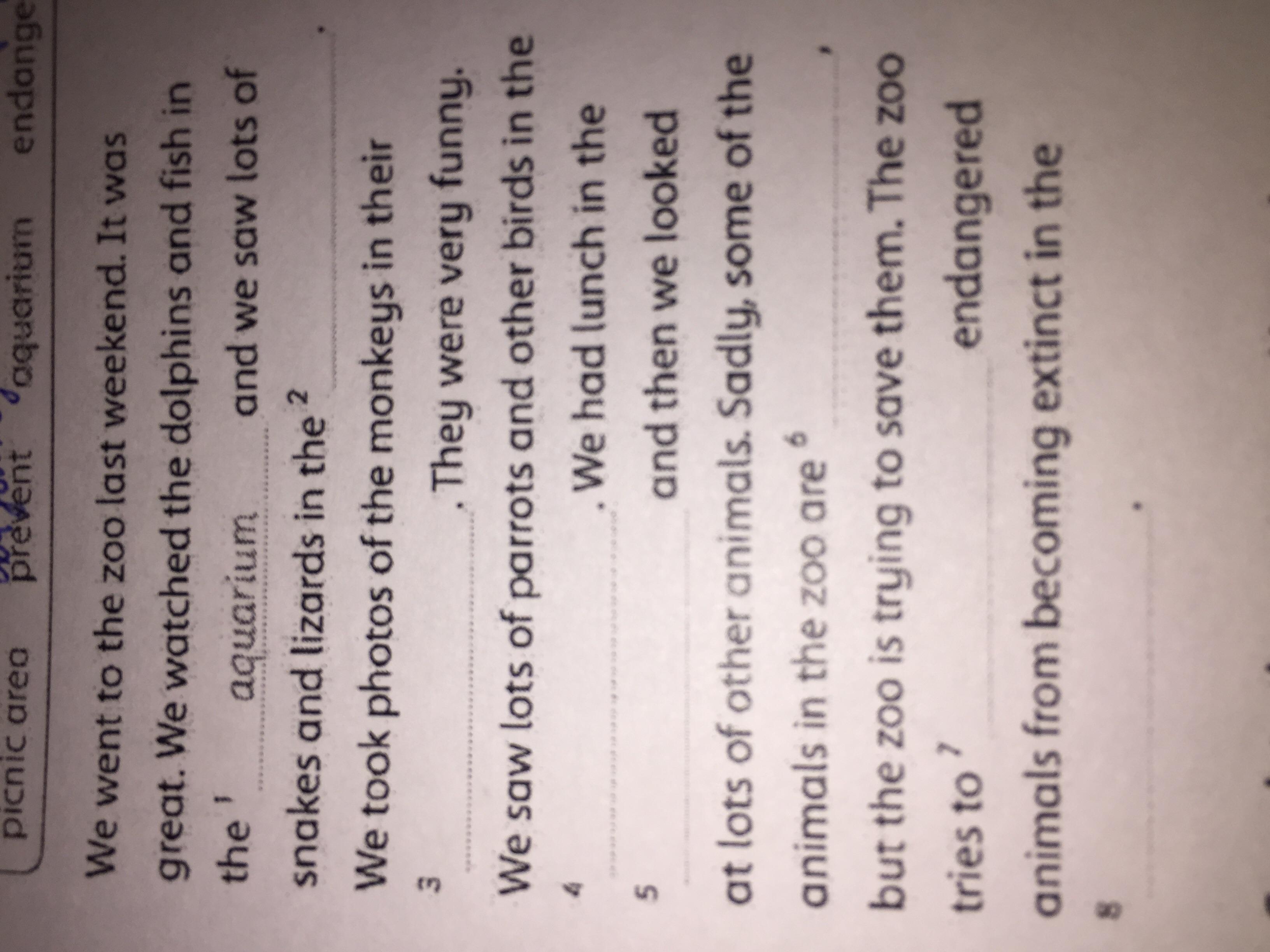 Помогите !!!!! Слова которых надо использовать: picnic area, prevent , aquarium, endangered, reptile house, enclosure, wild , aviary (дам 20 баллов )