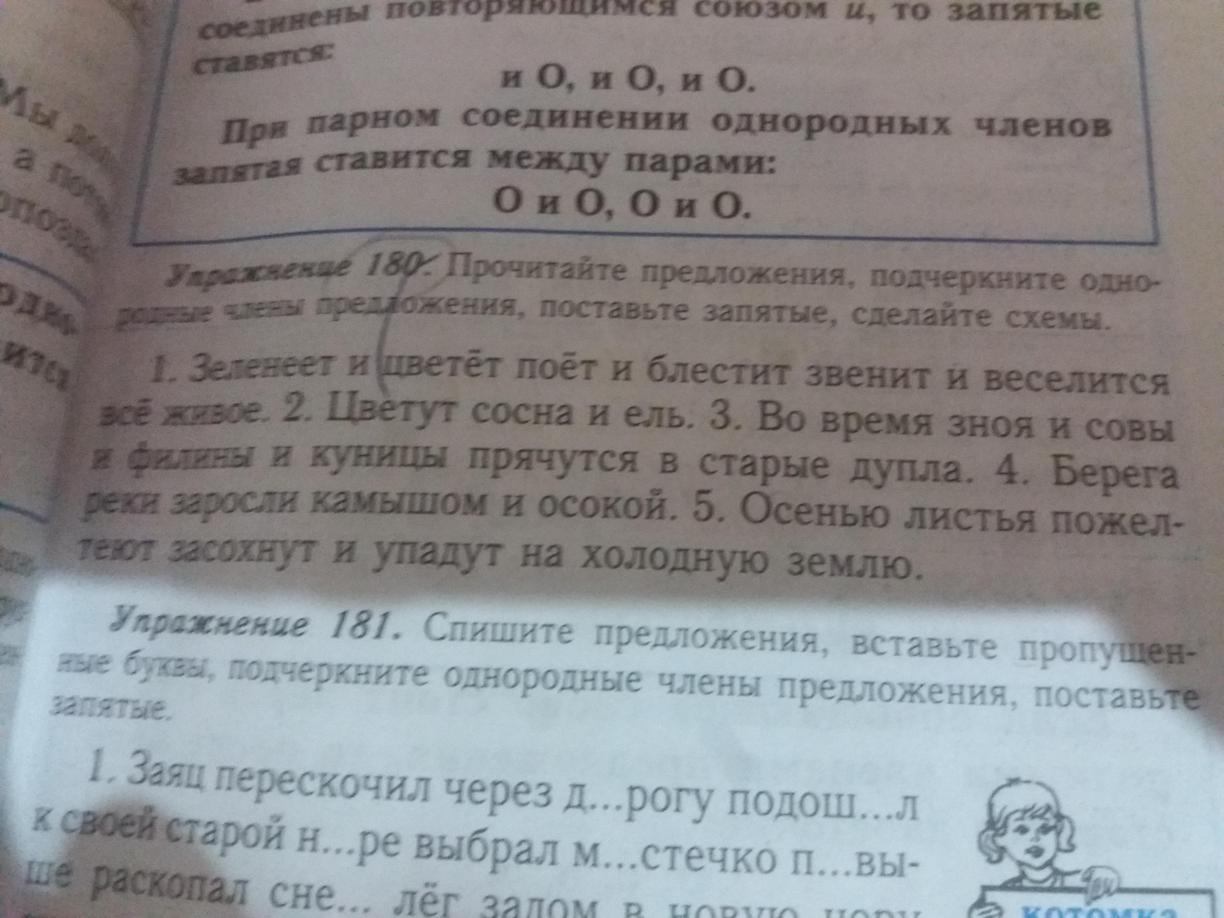 1. Зеленеет и цветёт, поёт и блестит, звенит и веселится всё живое. 2. Цветут сосна и ель. 3. Во время зноя, и совы, и филины, и куницы прячутся в старые дупла. 4. Берега реки заросли камышом и осокой. 5. Осенью листья пожелтеют, засохнут и упадут на холодную землю.
