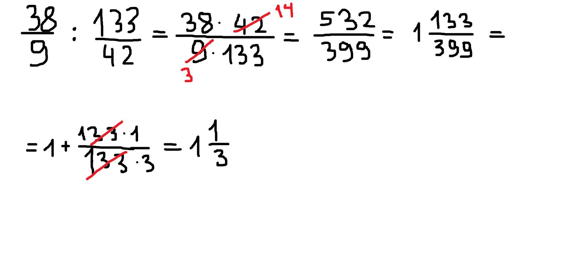 38/9:133/42=38/9*42/133=9 И 42 СОКРАЩАЕМ НА 3=(38*14)/(3*133)=532/399=1 133/399=СОКРАЩАЕМ НА 3=1 1/3.