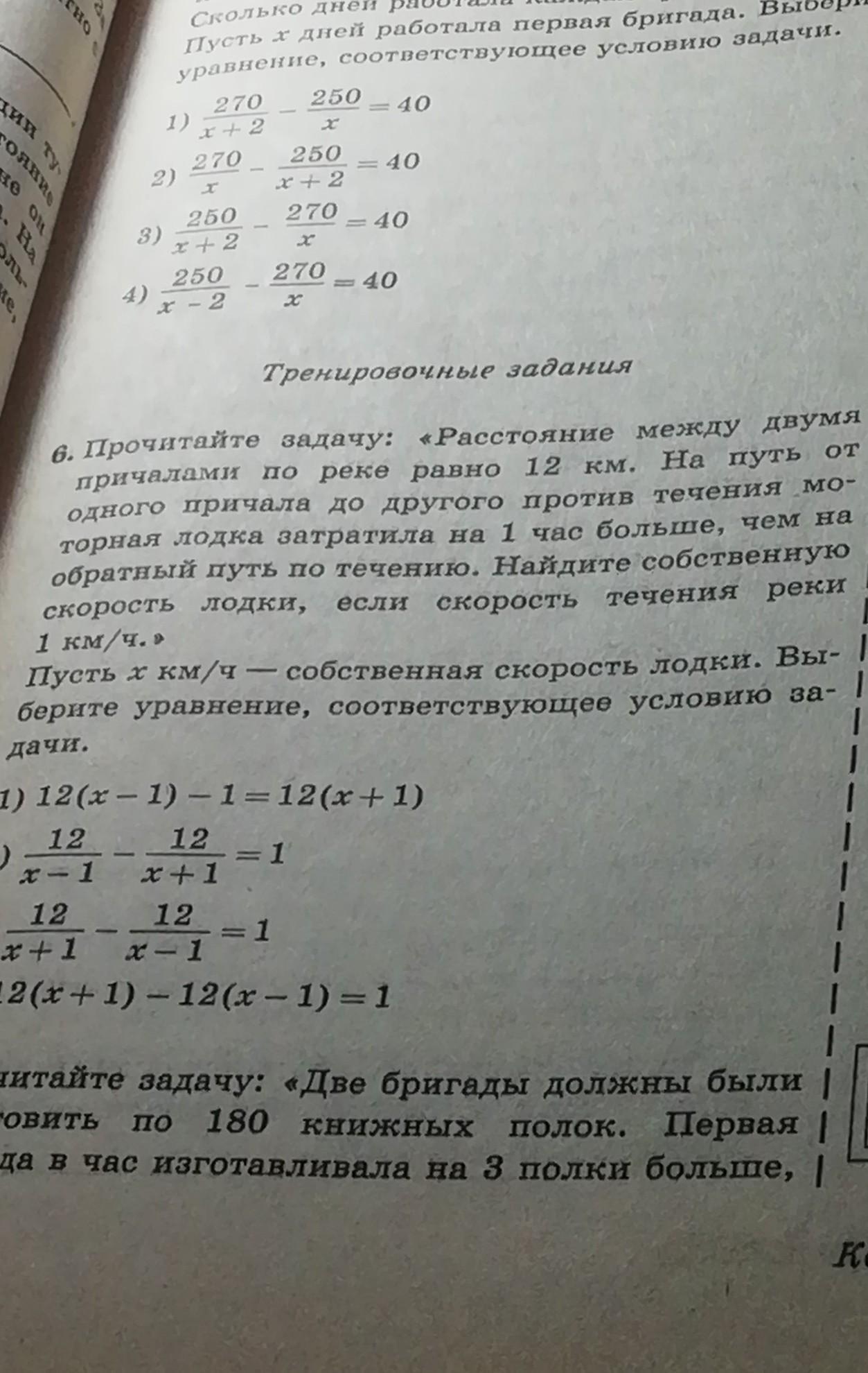 Время от одного причала до другого против течения составляет 12/(x-1) ч (скорость лодки равна собственной скорости минус скорость течения). Обратный путь по течению занимает 12/(x+1) ч (скорость лодки равна собственной скорости плюс скорость течения). Разность времен путей равна 1 часу, то есть 12/(x-1) - 12/(x+1) = 1