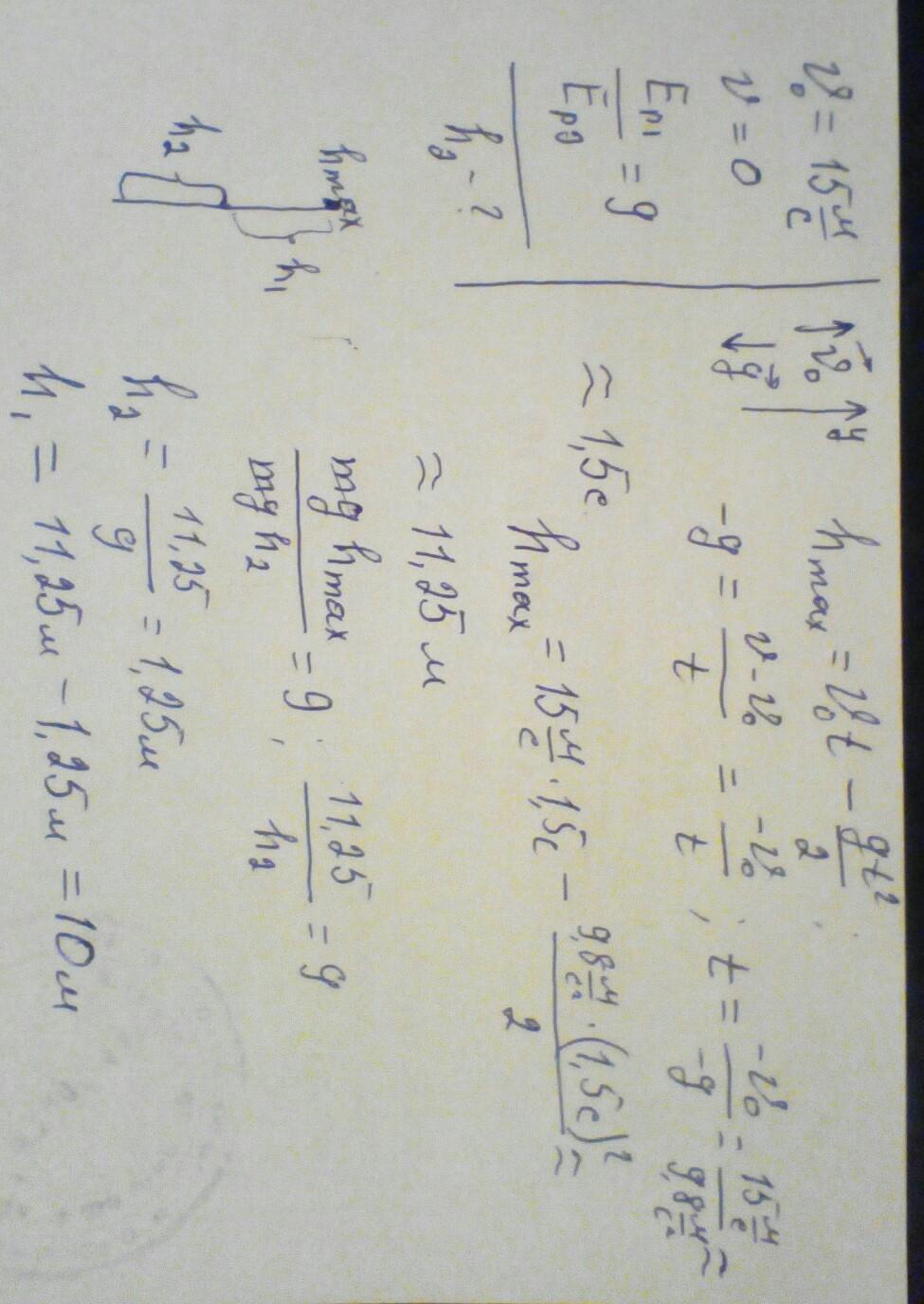 Камень бросили вертикально вверх с начальной скоростью 15 м/с. На каком расстоянии от точки максимального подъёма потенциальная энергия камня уменьшиться в 9 раз?