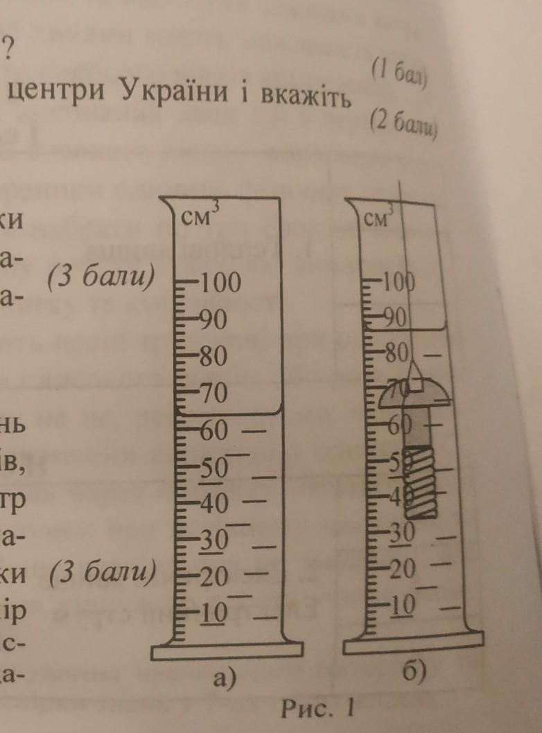 Визначити ціну поділки мензурки (рис 1, а) і об'єм рідини в ній. Визначити за рис 1 (б) об'єм тіла.