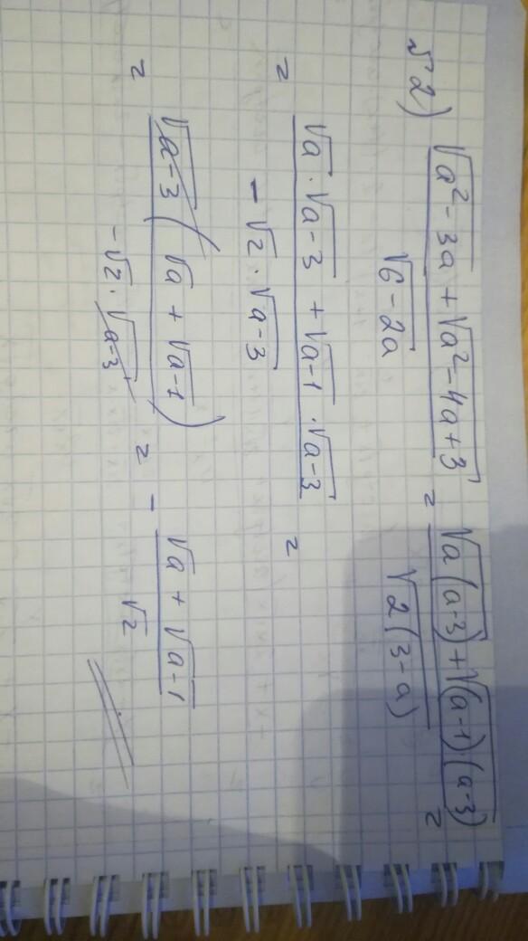 Объяснение: в 1-ом корне выносим "а", во 2-ом корне заключаем в скобки трехчлен, в 3-ем корне выносим 2; т.к. в числителе общий множитель получился а-3, а в знаменателе 3-а, то вынесем минус у знаменателя за скобку. Далее просто сокращение