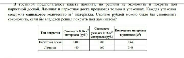 Планировалось класть ламинат, но положили паркет. Продаются только в упаковках. Каждая упаковка содержит одинаковое количество м^2 материала. На сколько дешевле вышел бы ламинат?