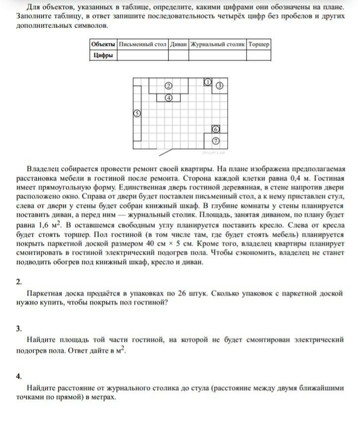 4. Нужно найти кратчайшее расстояние между 2-мя ближайшими точками журнального столика (4) до стула (6). Строим прямоугольный треугольник: от правой нижней точки столика (4) опускаем отрезок длиной в 3 клетки (для удобства назовем его АВ) и перпендикулярно ему (под углом 90°) строим второй отрезок, (ровно) вправо, на 4 клетки (ВС). Если соединить начальную и конечную точки нашего чертежа (назовем эту линию (по совместительству гипотенузу треугольника) АС), получится прямоугольный треугольник. Так как 2 стороны нам известны-это отрезки что мы строили (по совместительству катеты), то гипотенузу мы сможем найти по теореме Пифагора: