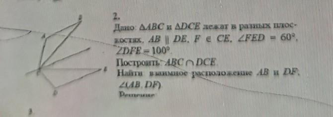 Дано: △АВС и △DCE лежат в разных плоскостях. AB||DE, F ∈ CE. ∠FED = 60° ∠DFE = 100°.