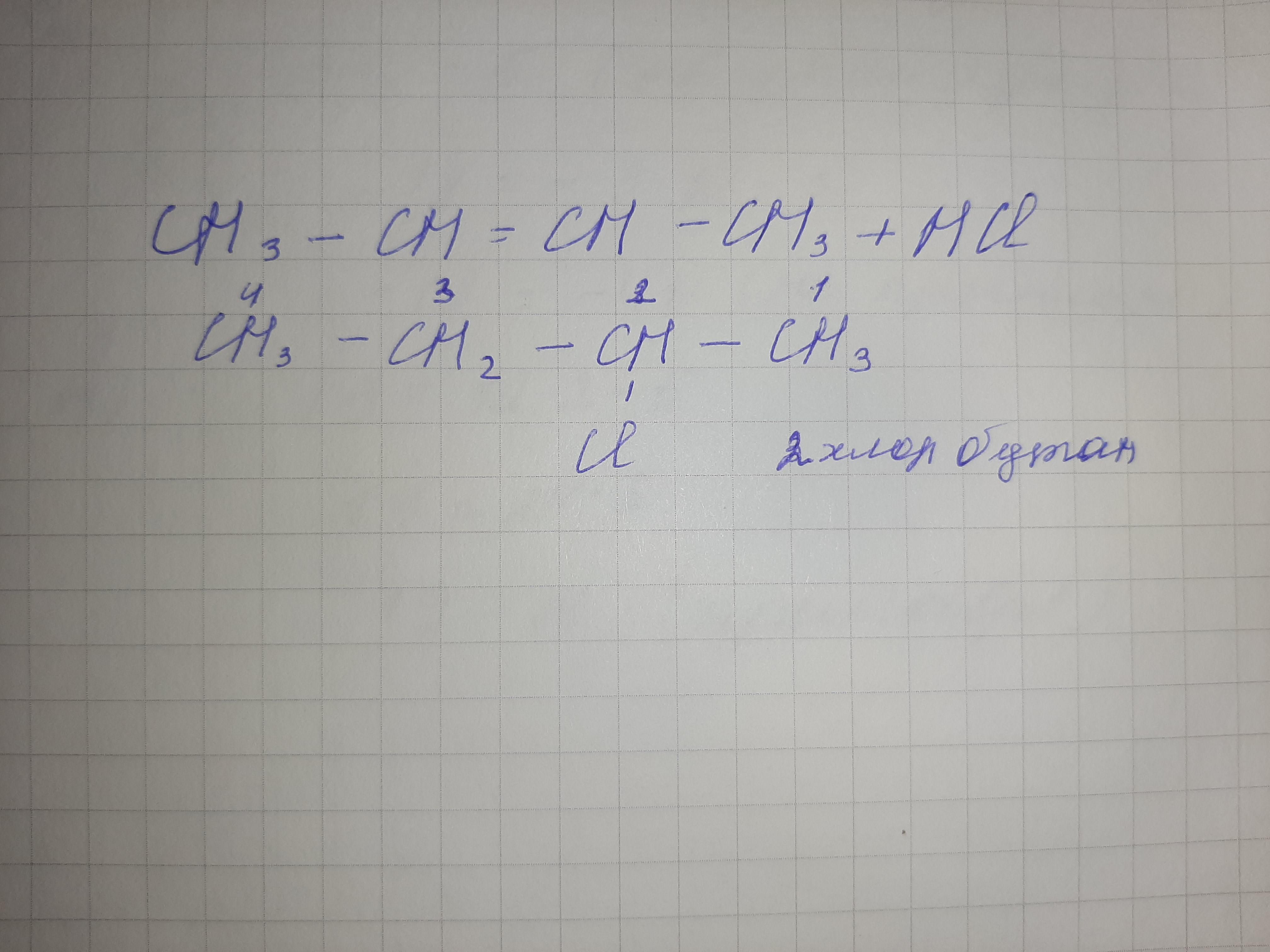 СH3 - СH = СH - СH3 + HCl -> CH3-CH2-CH(Cl)-CH3