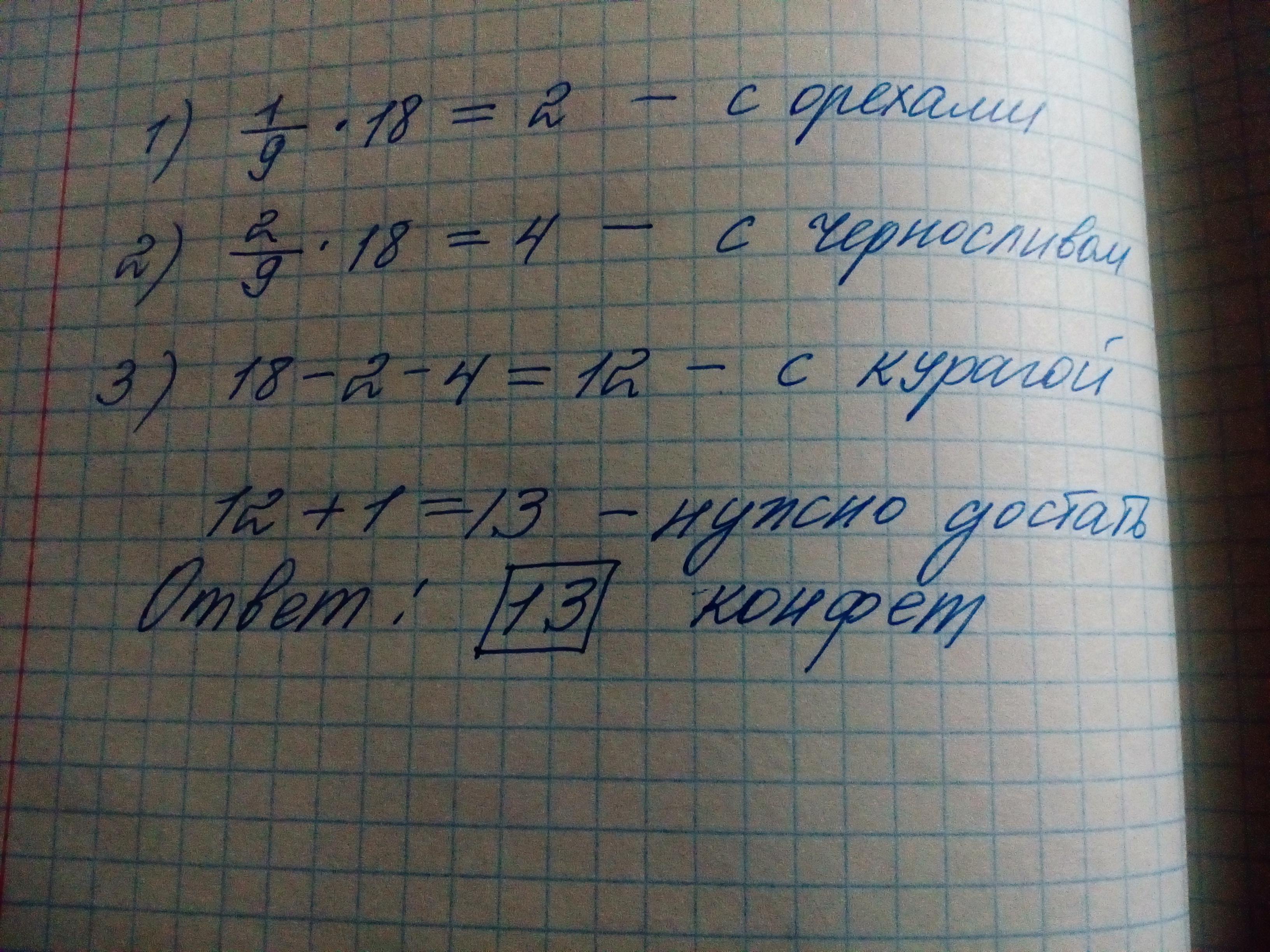 В конфетнице было 18 конфет. Из них 1/9 часть конфет была с орехами, 2/9 части - с черносливом, а остальные конфеты были с курагой. Какое количество конфет нужно достать не глядя, чтобы в руках оказались любые 2 вида конфет?