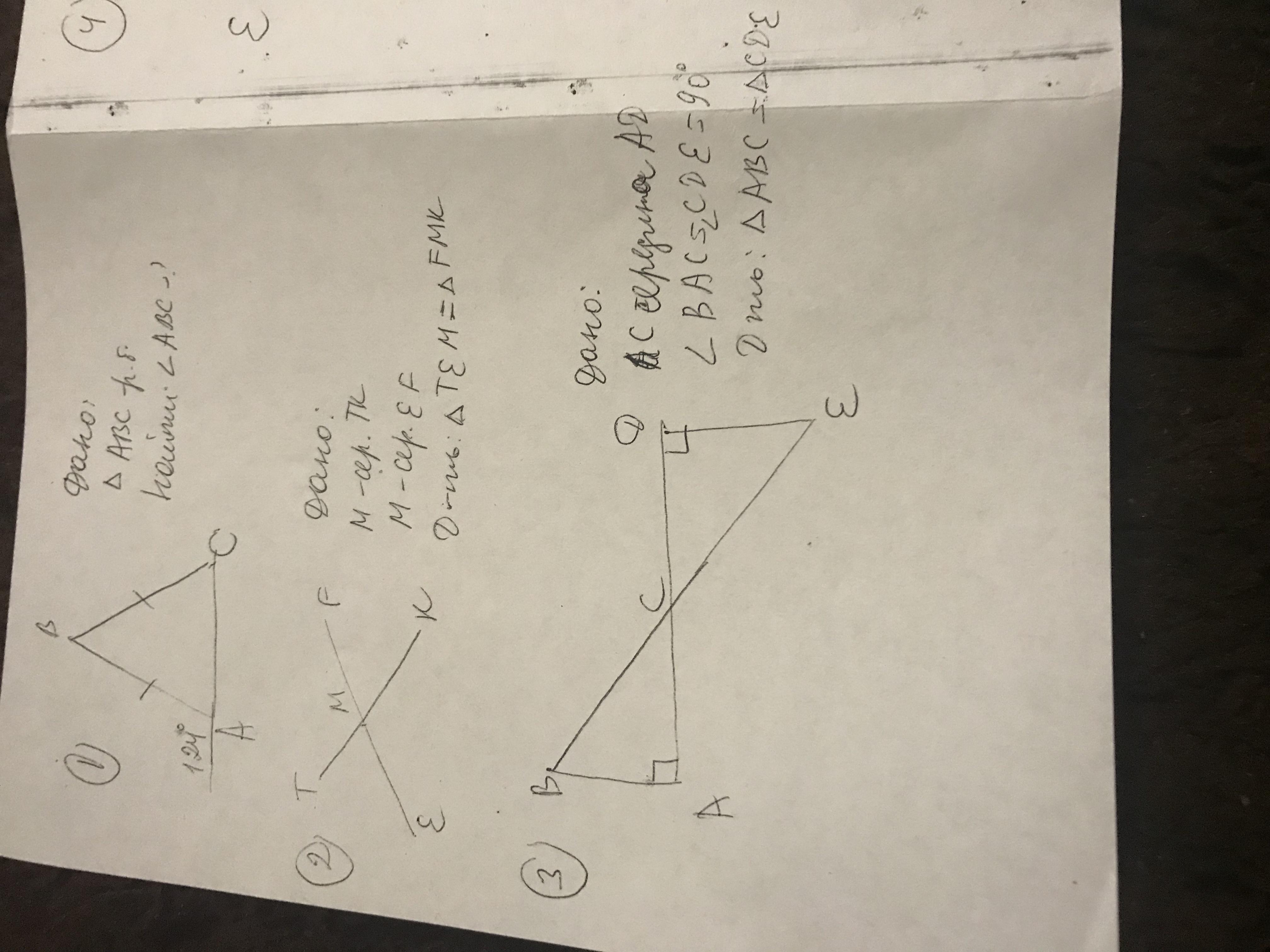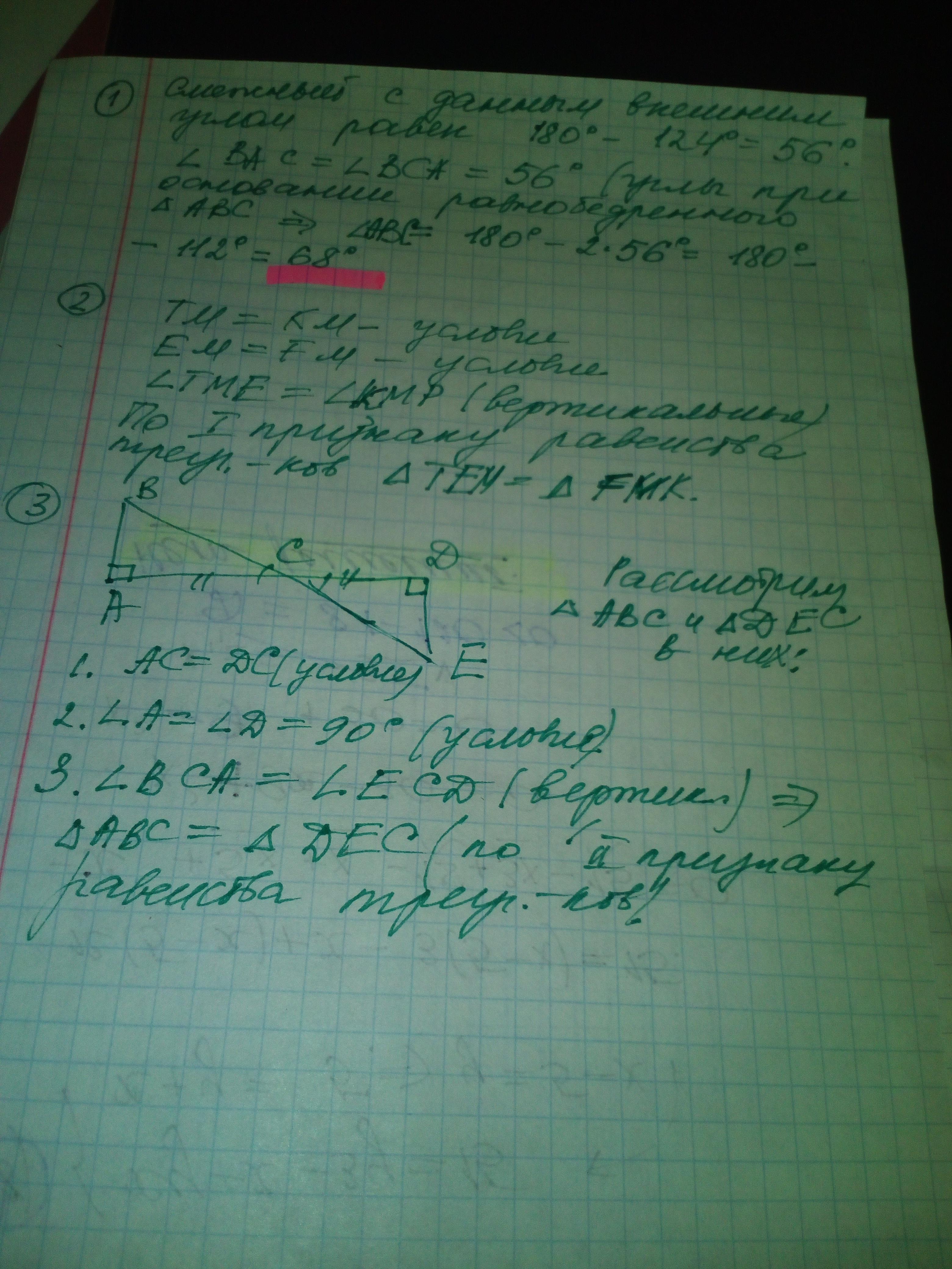 так как ТМ=МК, МF=ME (по услов), угол ТМЕ=КМF(вертикальные углы),то ТЕМ=FEM(по 1 призн рав треуг)