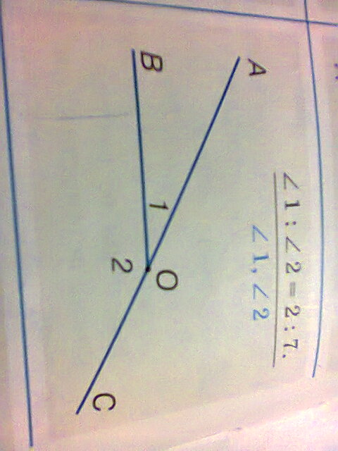 угол1 и угол2 образуют развернутый угол вместе, т.е. угол1+угол2=180, значит угол1=180-угол2. По условию угол1/угол2=2/7 или (180-угол2)/угол2=2/7, решая уравнение получаем что угол2=140, ну и соответственно угол1=180-140=40