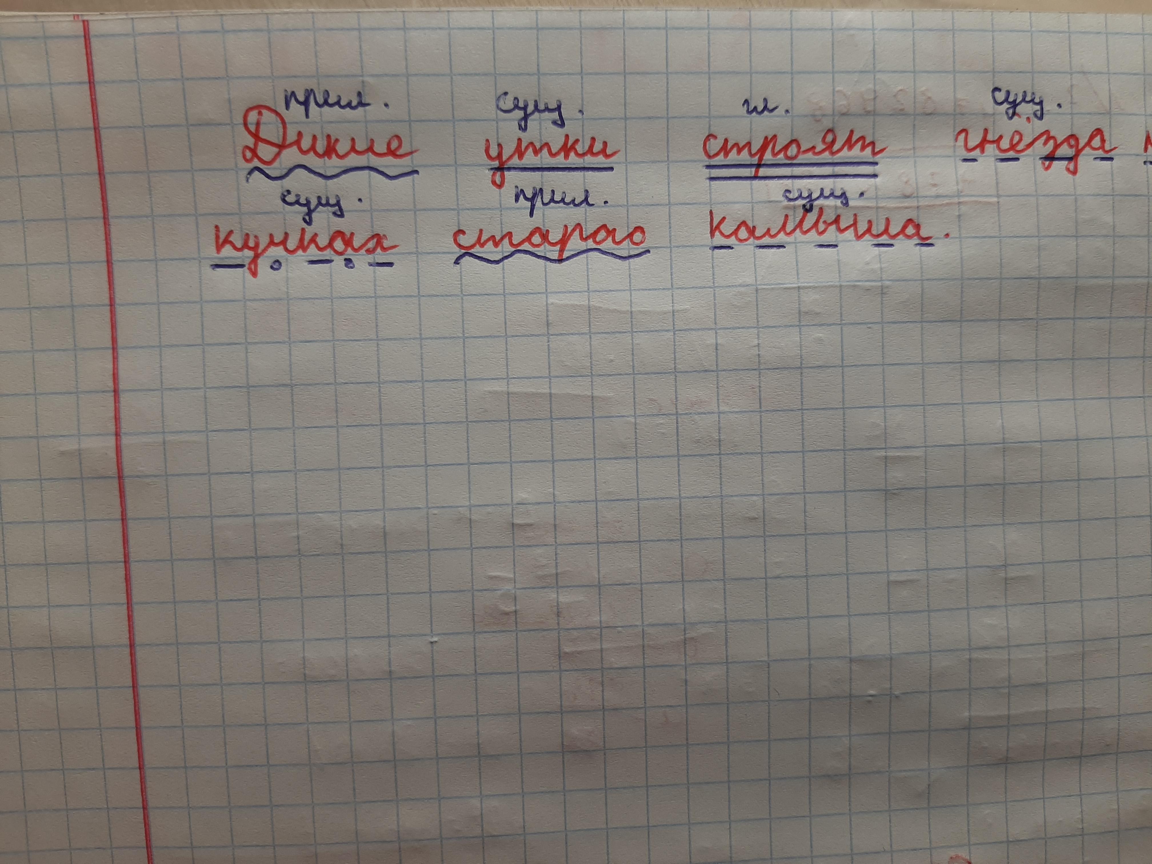 Дикие прилагательное. Утки сущ. Строят гл. Гнёзда дополнение. Старого прил. Камыша доп.