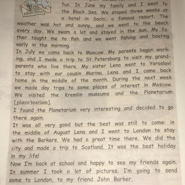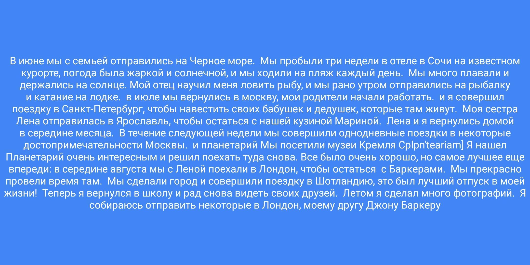 Все было хорошо но самое лучшее было когда в середине Августа я и Лена поехали в Лондон остаться с Баркерами.Мы там великолепно провели время.Мы сделали город и поехали в Шотландию.Это были лучшие каникулы в моей жизни!