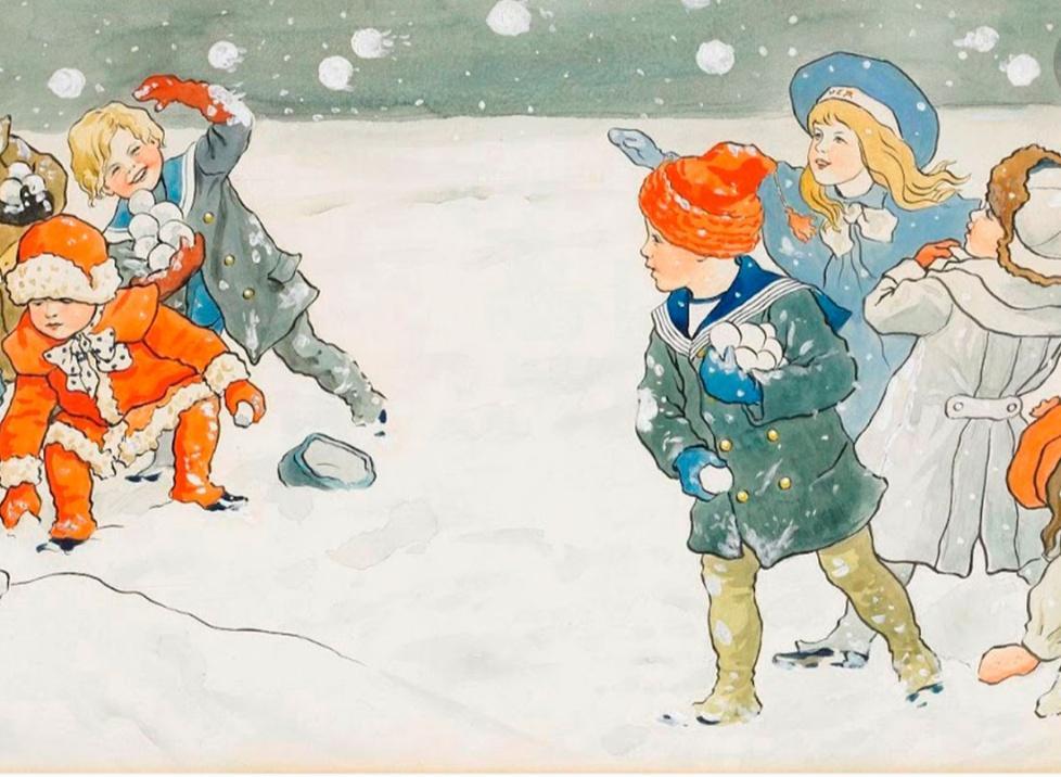 It is winter in the picture. It is snowing. The children are playing snowballs. The boys and the girls are wearing warm winter coats and hats. Also they are wearing tights and winter boots. They are laughingand smiling.