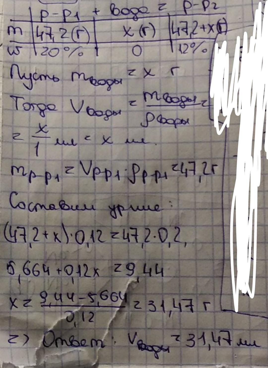 Сколько кубических сантиметров воды нужно добавить к 40 кубическим сантиметрам 20-процентного раствора хлорида кальция(плотность = 1,18 г/см^3), чтобы получить 12-процентный раствор?