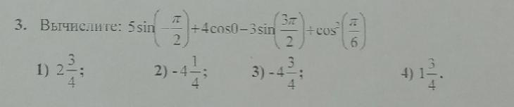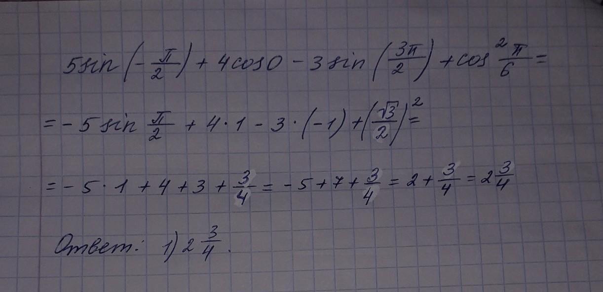 5sin(-π/2)+4cos0-3sin(3π/2)+cos²(π/6) = -5+4+3+3/4 = 2 3/4