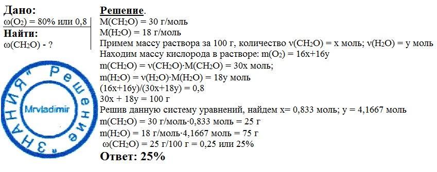 Массовая доля кислорода в растворе формальдегида составляет 80%. Вычислить массовую долю альдегида в растворе.