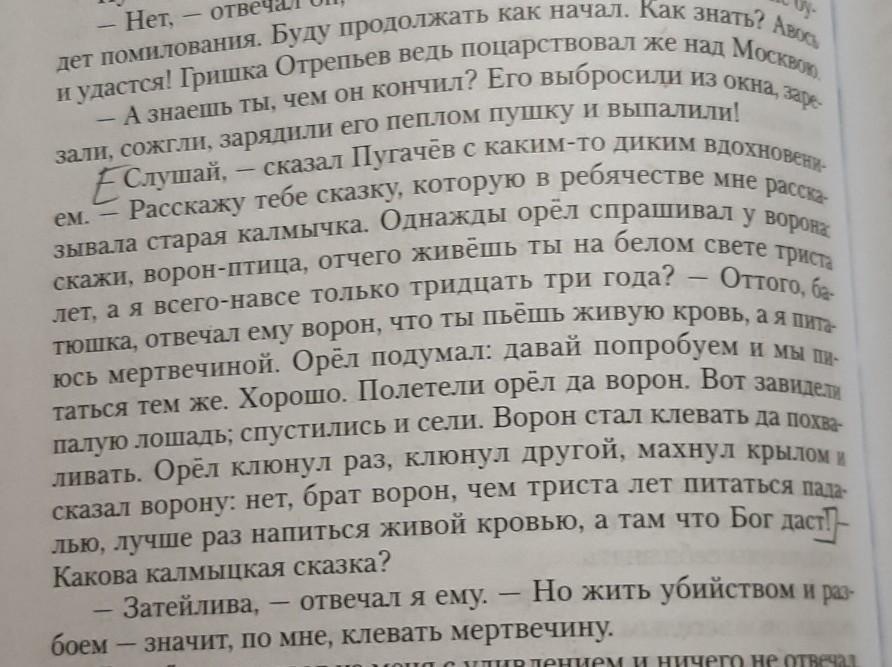 3) В притче орел говорит: "А там, что Бог даст..." Пугачев не хочет ничего менять, хоть и признает, что он далеко зашел. Признает, что он самозванец! Но "авось и удастся"...