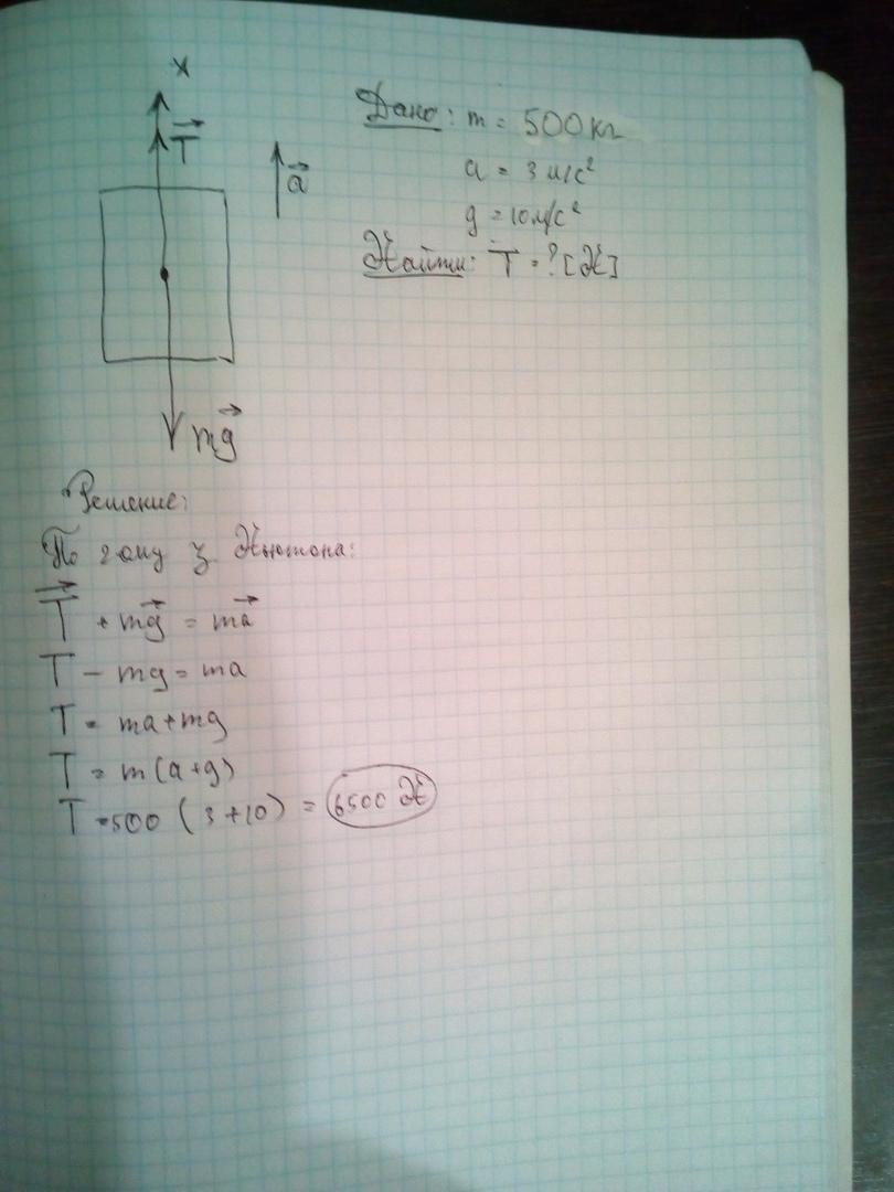 Лифт массой 0,5 т движется вверх с ускорением 3 м/с2. Если принять g=10м/с2, то сила натяжения троса кабины лифта составит:
