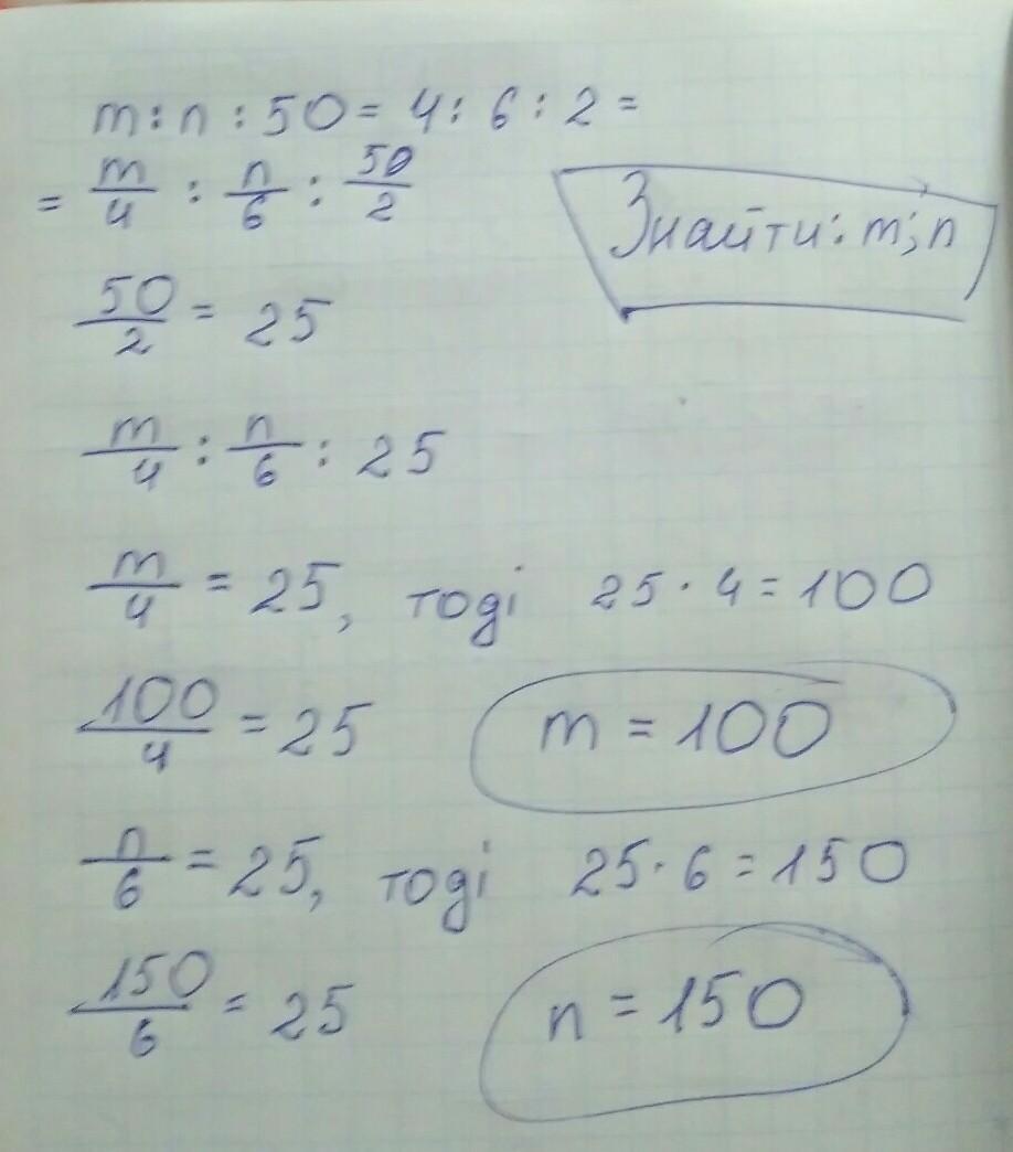 Якщо m:n:50 = 4:6:2 то треба розділити 50 на 2 =25