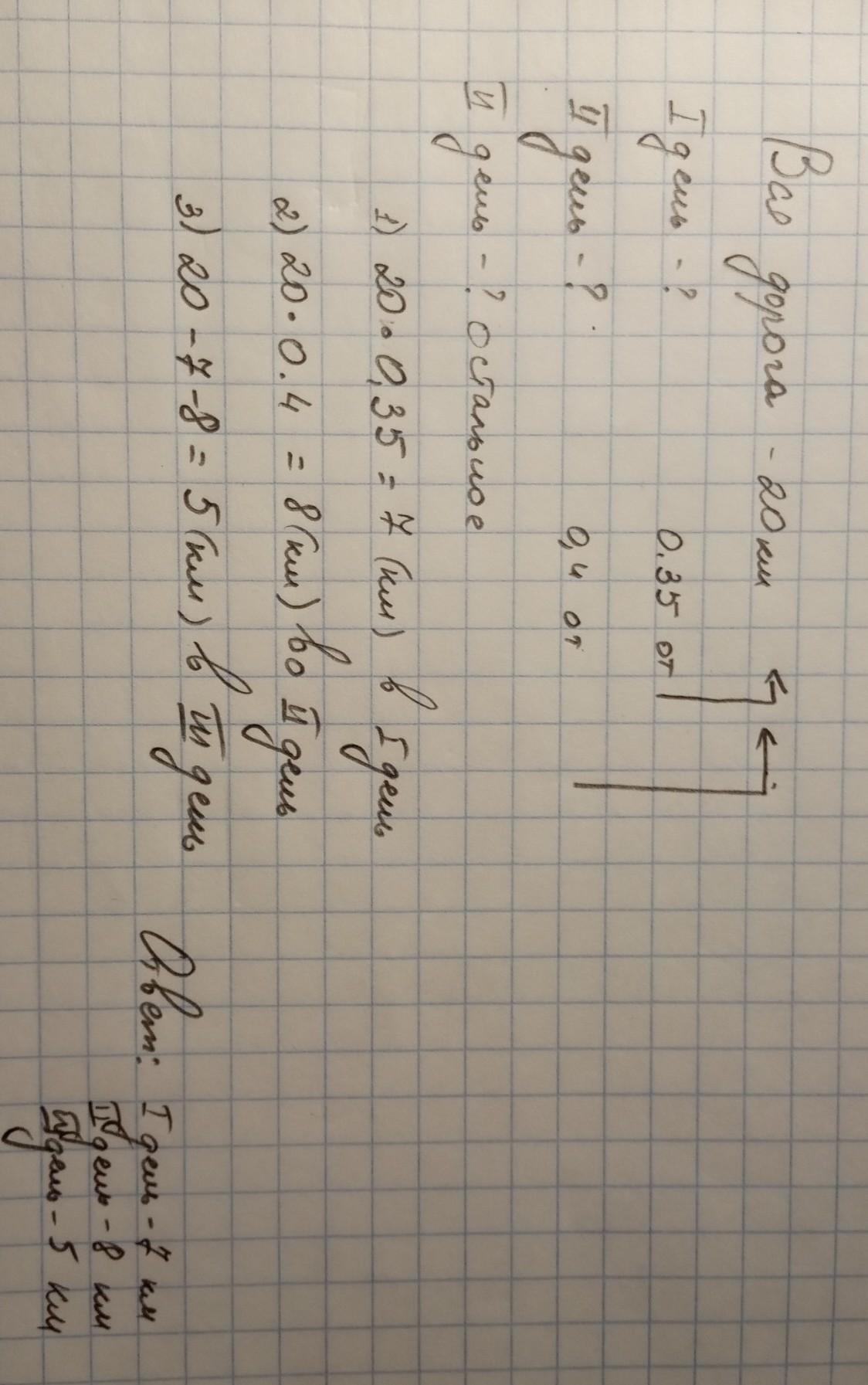 При ремонте участка шоссе длинной 20 км в первый день отремонтировали 0.35 всего участка.Во второй день 0.4 всего участка.Остальное в третий день. Сколько км ремонтировали каждый день Условие и решение пожалуйста
