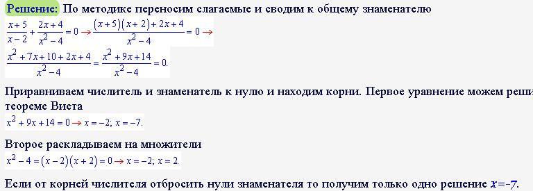 Но решая уравнение в числителе мы уже получили корень -2, но так как его нельзя подставлять в знаменатель, он является посторонним, остается корень -7.