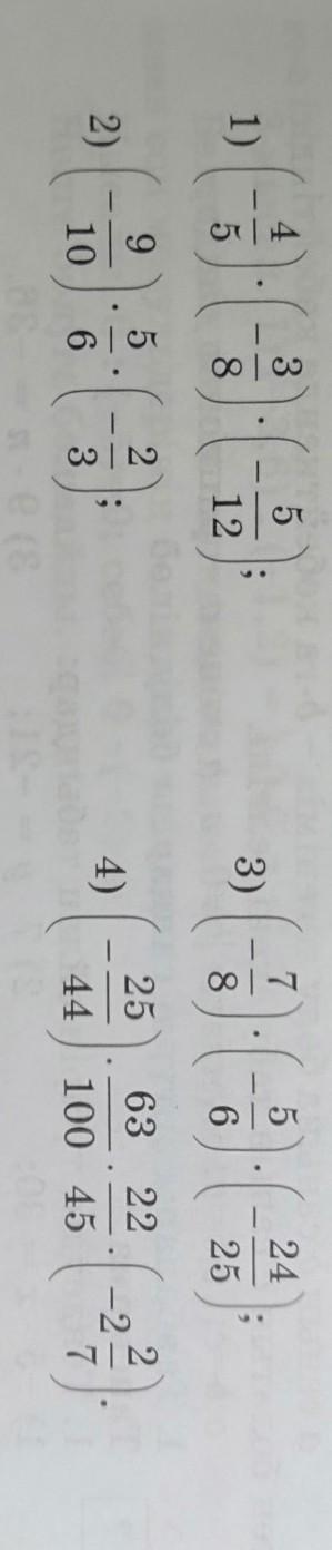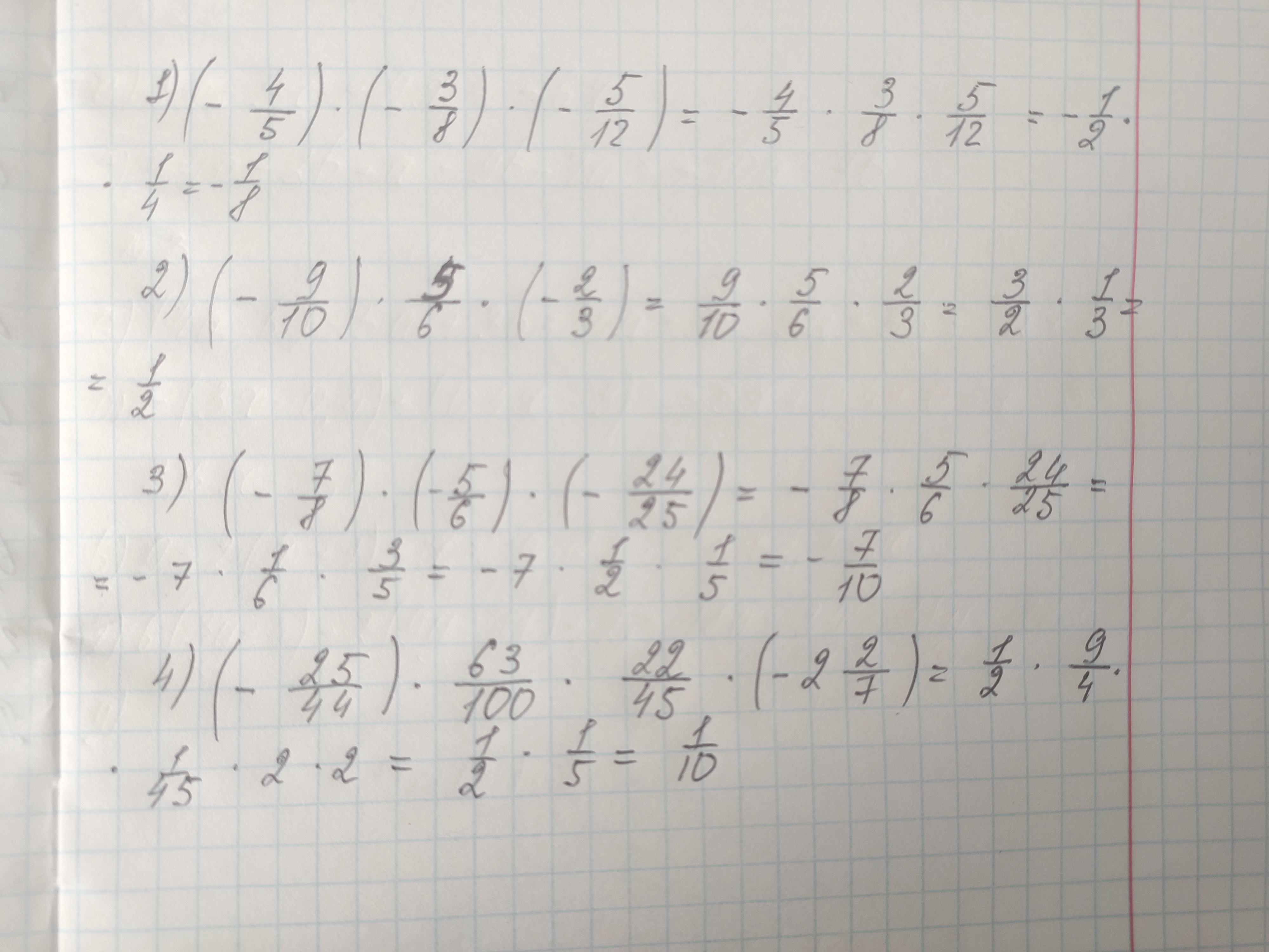 (-4/5) × (-3/8) × (- 5/12) = 12/40 × -5/12= -60/480= -1/8