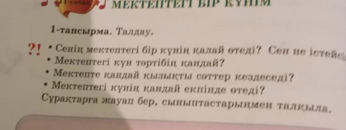 Мен тұрамын,жуынамын,тамақты ішемін,мектепке барамын,сабақта ұй жұмысын айтамын,сабақ бітеді,үйге барамын