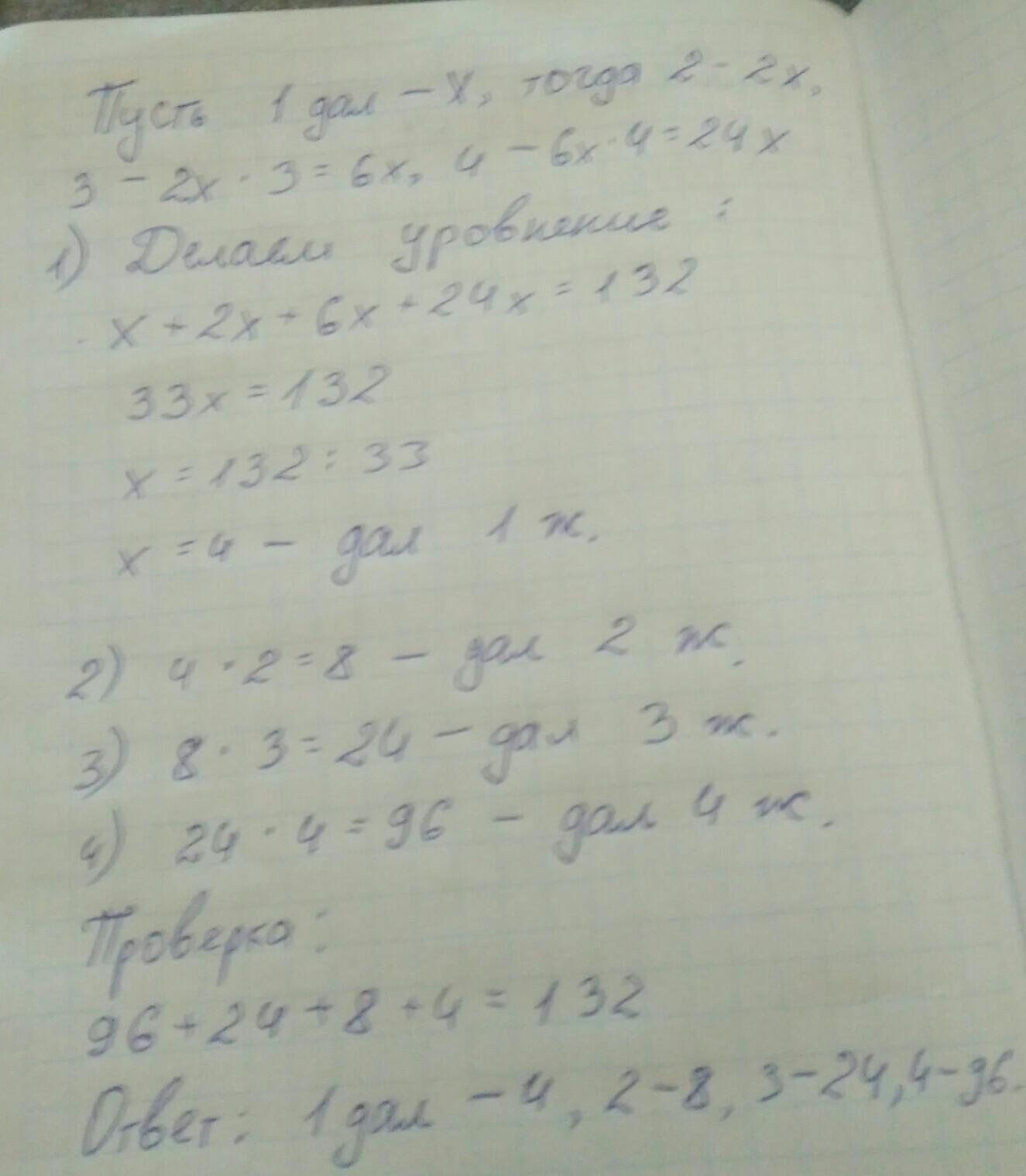 Из четырёх жертвователей второй дал вдвое больше первого, третий - втрое больше второго, четвёртый - вчетверо больше третьего, а все вместе дали 132. Сколько дал первый? Как бы ее решили в Древней Индии???