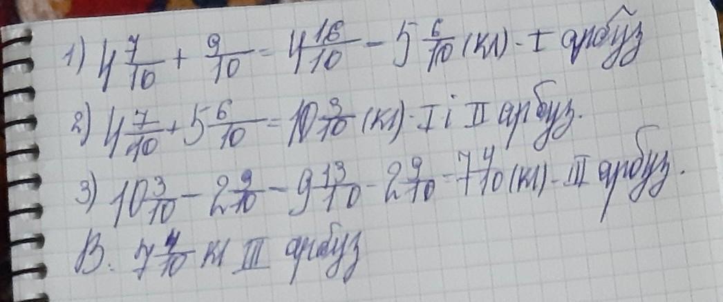 Было куплено три арбуза. Масса первого 4 целых 7/10кг, второго на 9/10кг больше, третьего на 2целых 9/10кг меньше суммы масс первооо и второго арбузов. Чему равна масса третьего арбуза?
